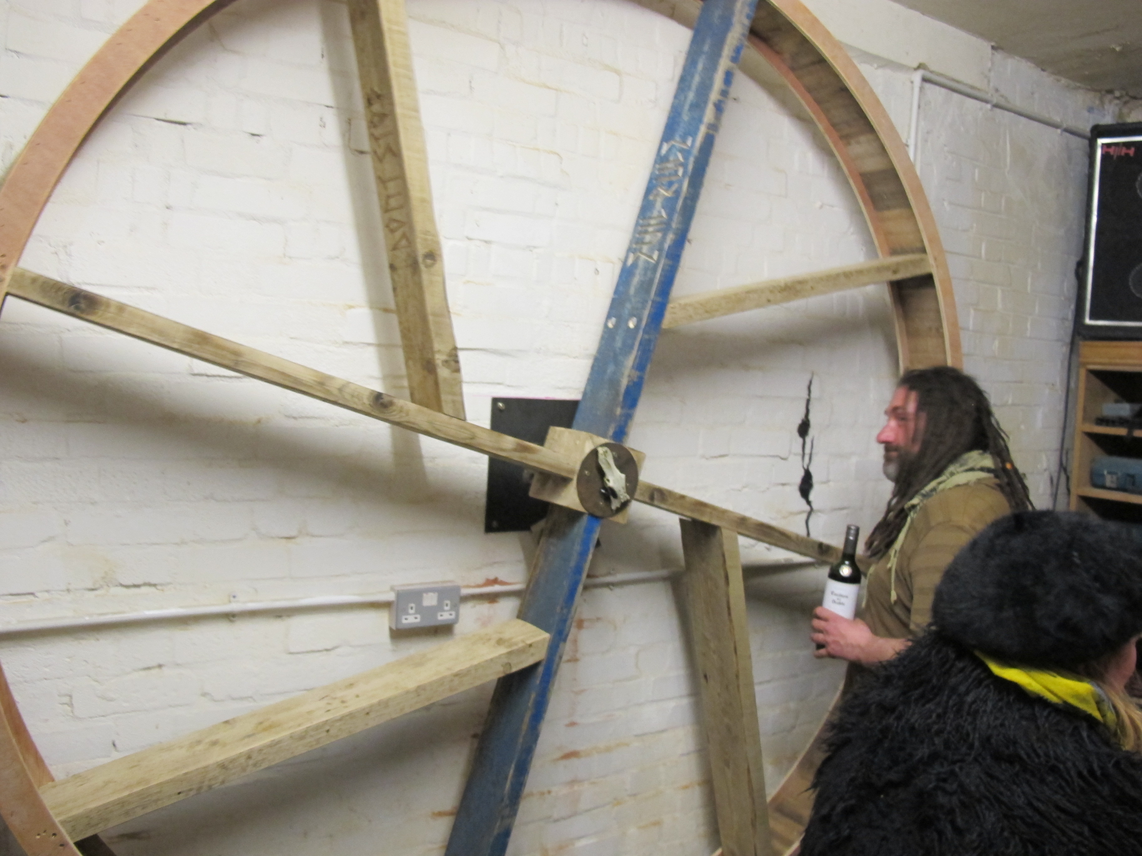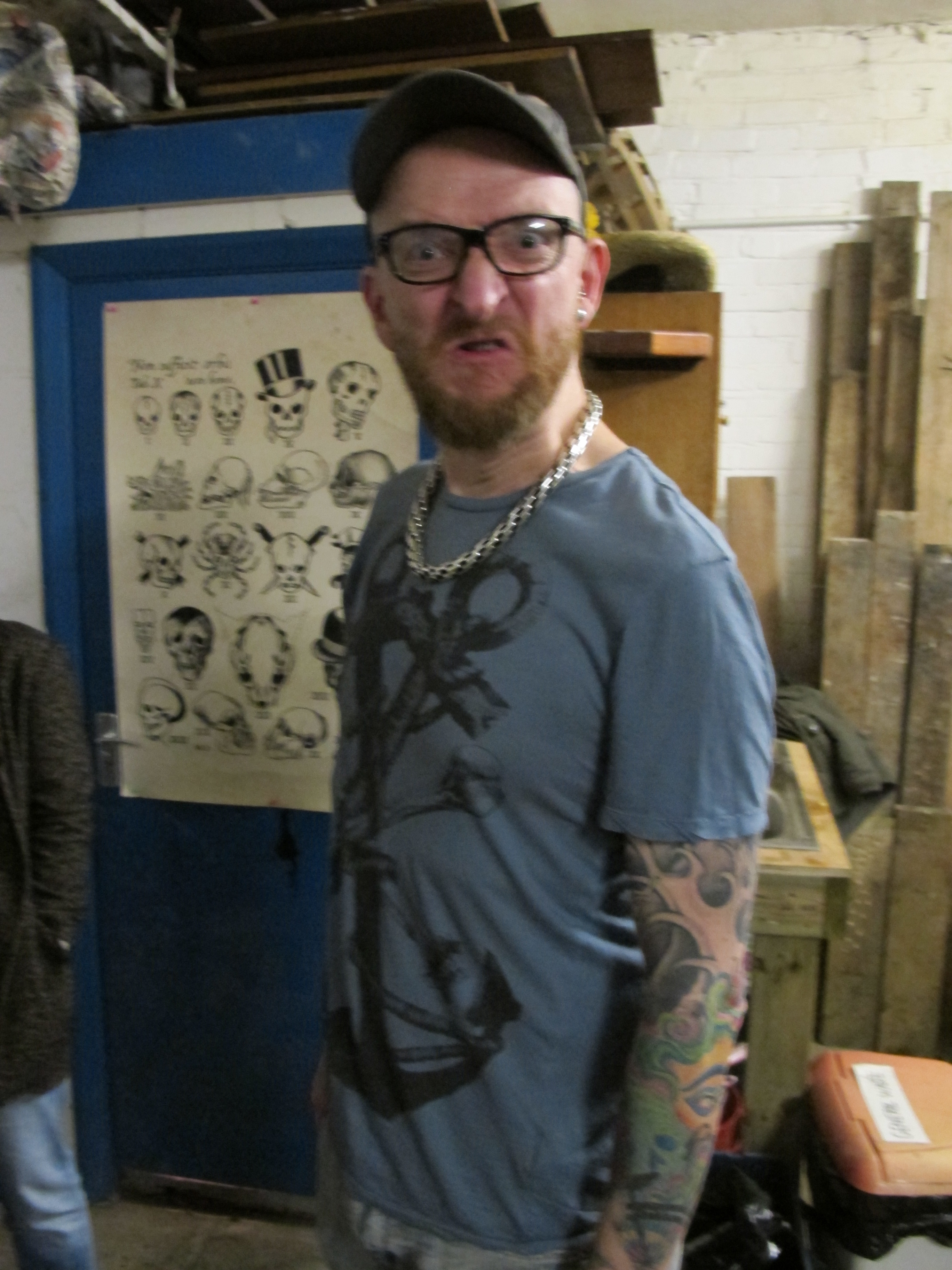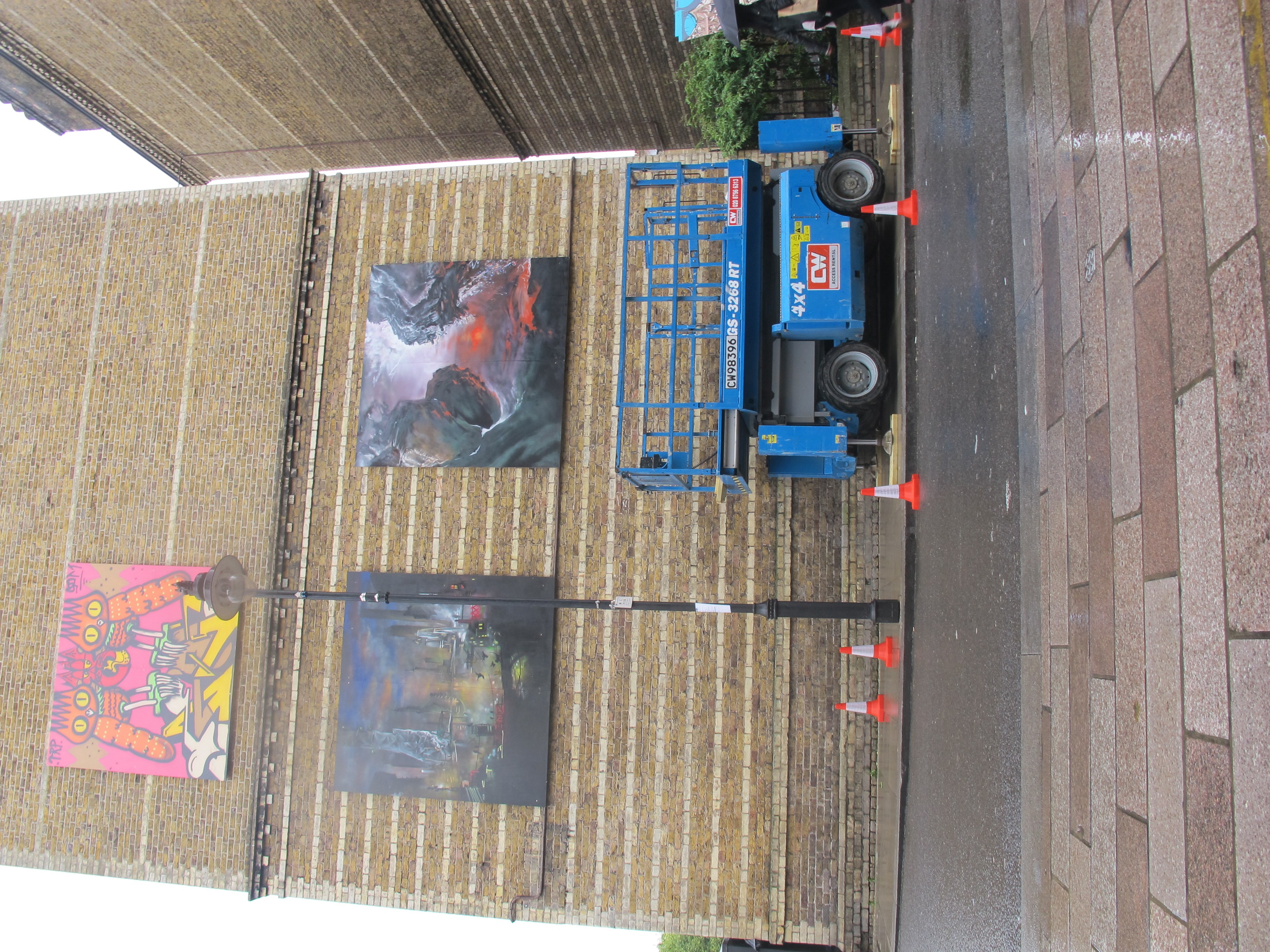 Live stencil painting by our mate Teddy Baden throughout the day put a couple of nice new pieces on the workshop wall . Bits of our work were on display including gas bottle burner , shopping trolley chair . donkey dharma wheel , some forged sculpture by Fle and prints by Dawn .