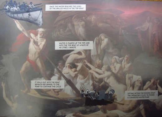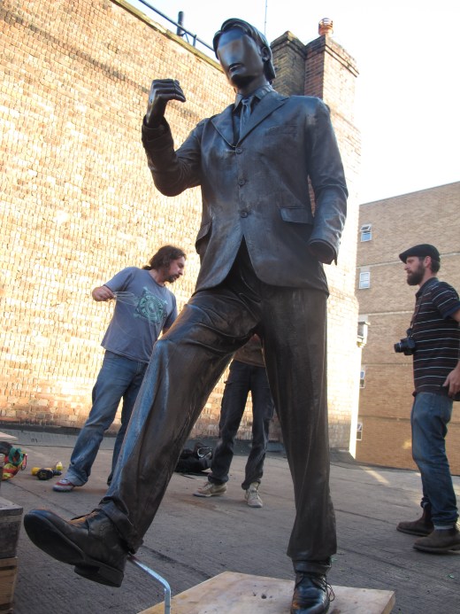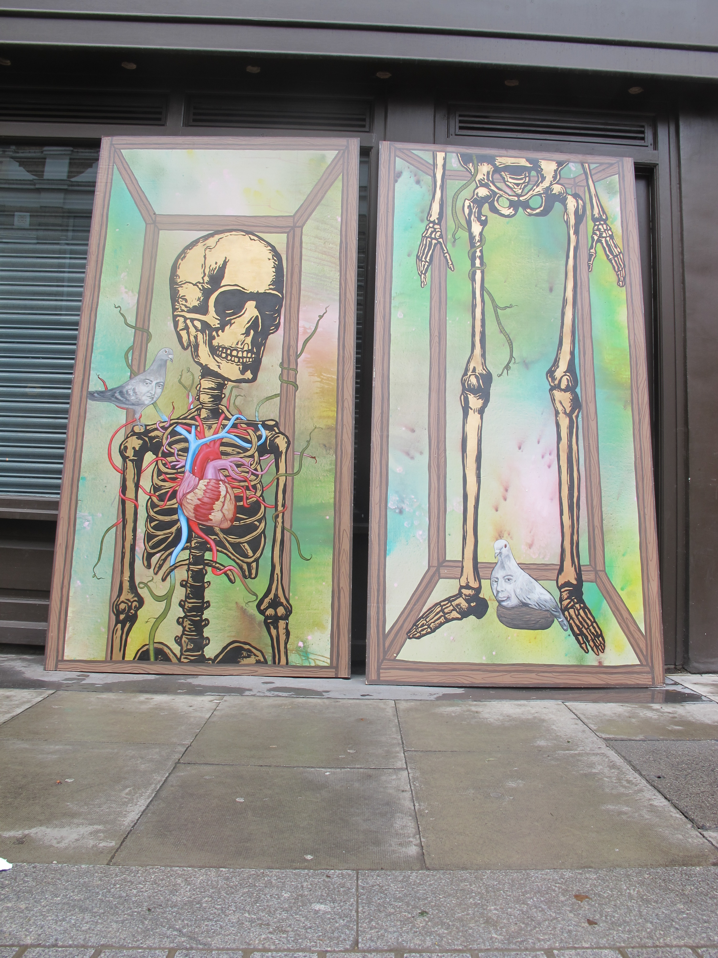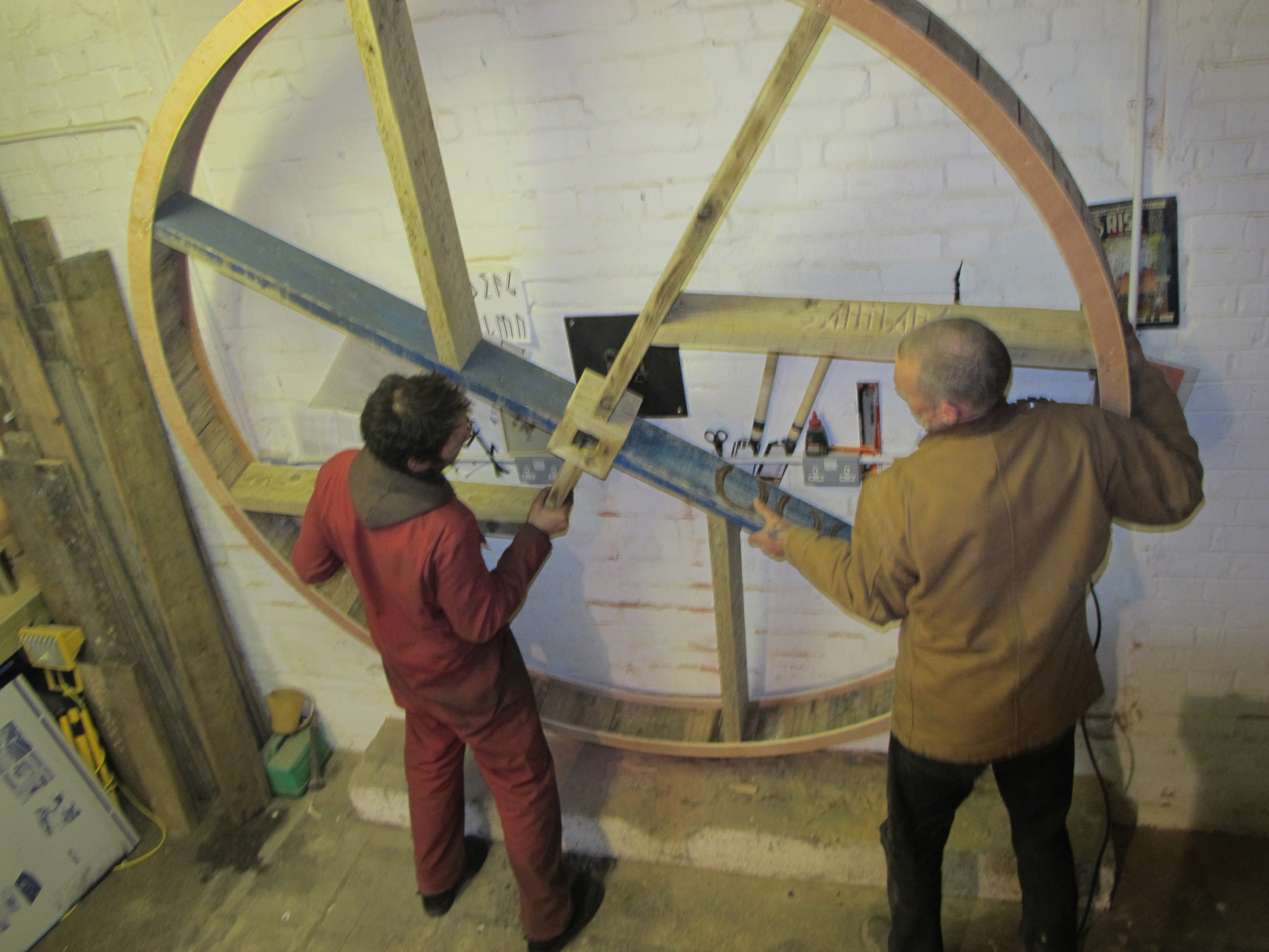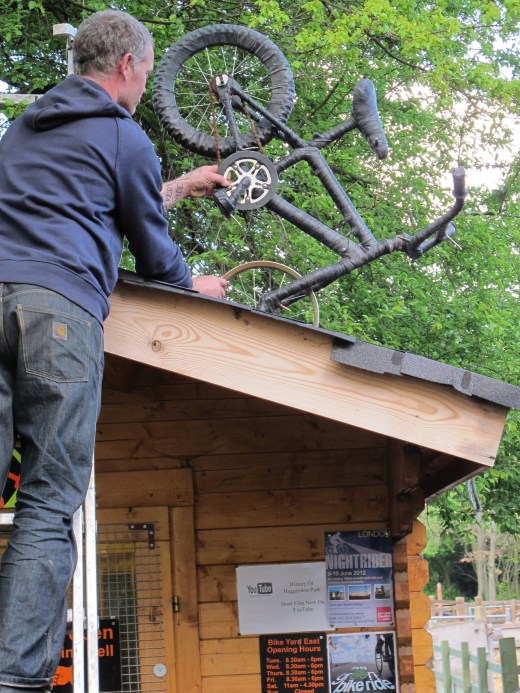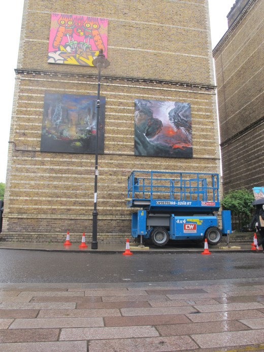 Live stencil painting by our mate Teddy Baden throughout the day put a couple of nice new pieces on the workshop wall . Bits of our work were on display including gas bottle burner , shopping trolley chair . donkey dharma wheel , some forged sculpture by Fle and prints by Dawn .