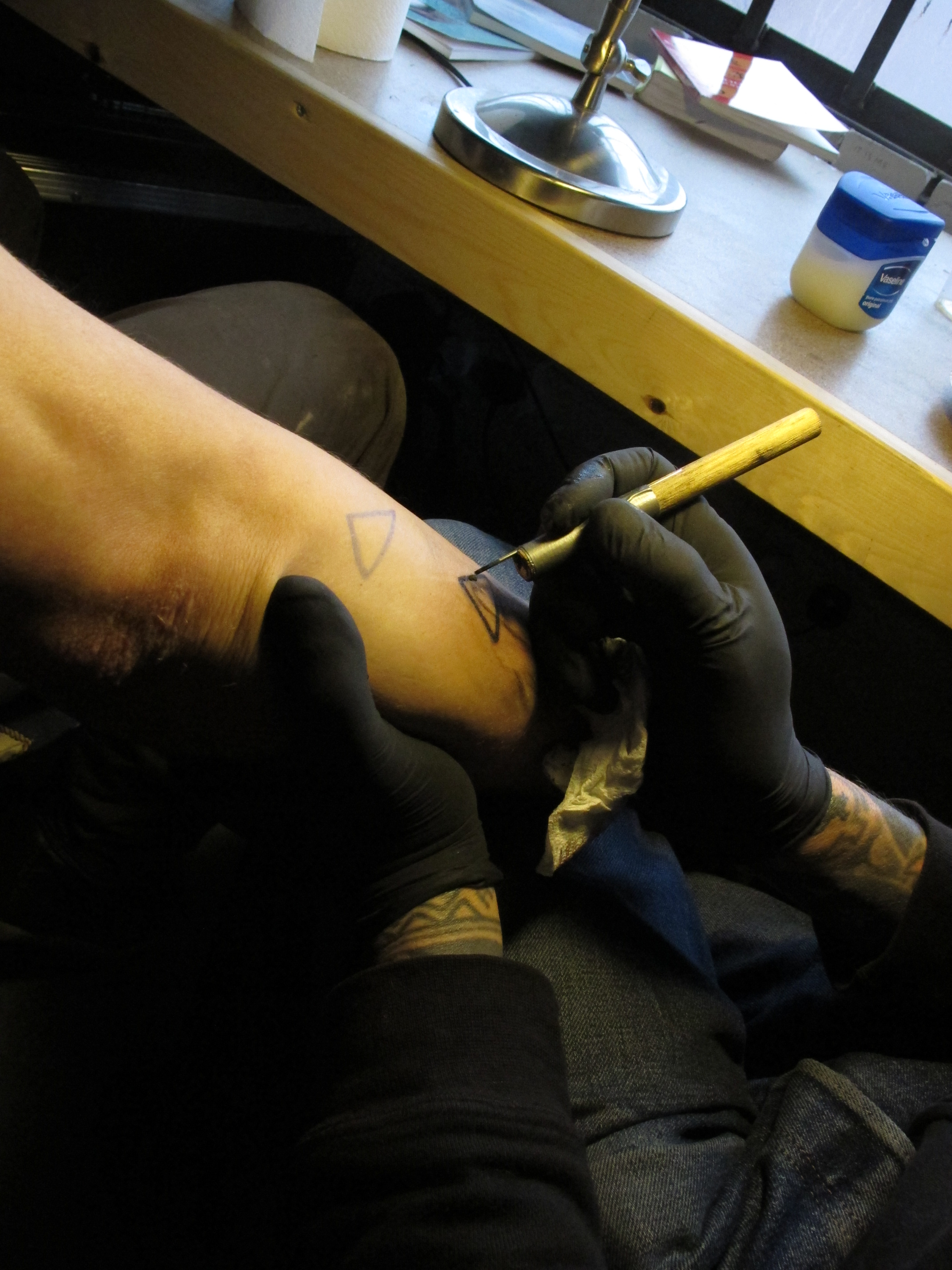 Alex Binnie came along to tattoo all day . Decided to go old school and do small hand poked tats . Got a pentagram myself to be closer to dog .